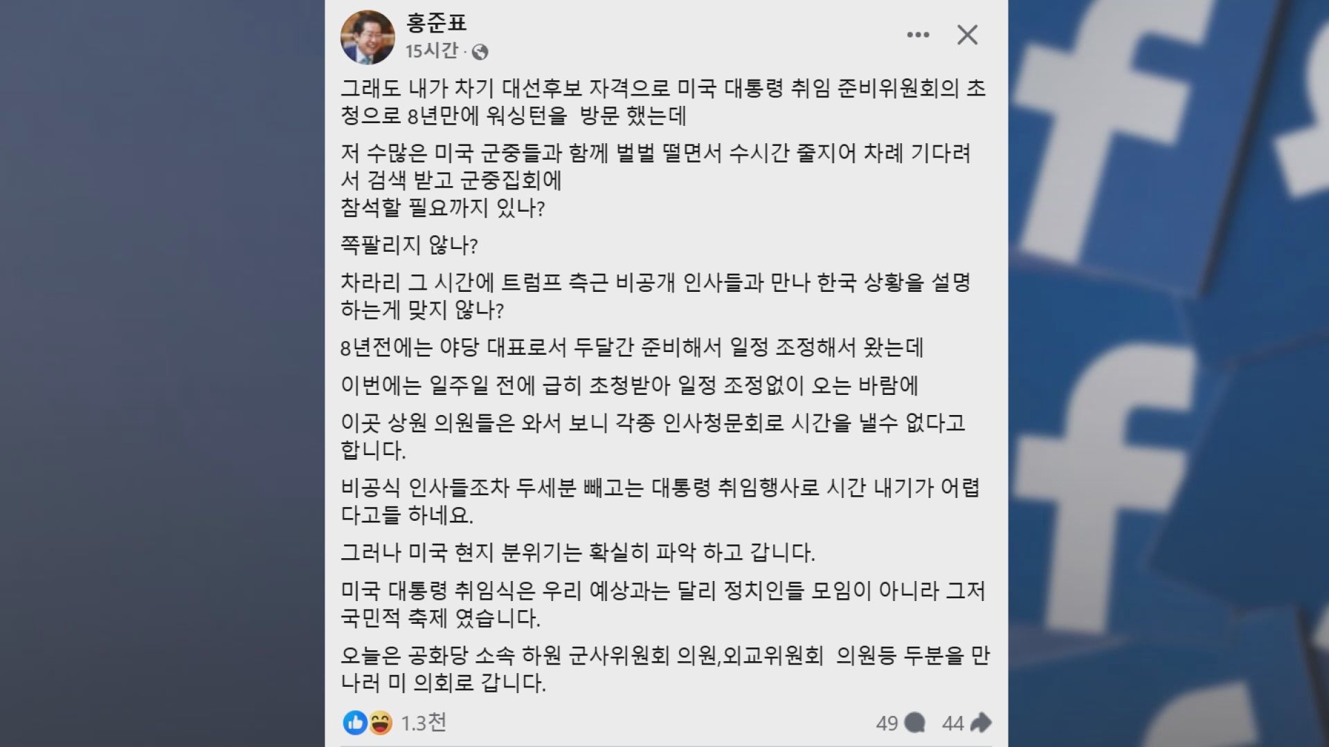 홍준표 대구시장은 윤 정부 특사로 취임식 참석 논의가 있었지만 탄핵으로 무산됐다, 한국에 왔던 트럼프 대통령 측 인사와 비공개 회담을 가졌다면서 떠나기 전에 큰 역할을 할 것처럼 공언하고 가서 그럴까요? 성과나 결과에 사람들이 고개를 갸우뚱하는 것 아닌가 싶습니다.