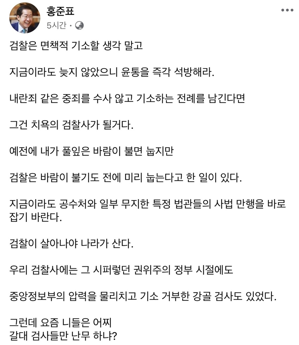 홍 시장은 내란죄 같은 중죄를 수사 않고 기소하는 선례를 남긴다면 치욕의 검찰사가 될 것이라며 갈대 검사들만 난무하냐며 검찰에 대한 비판을 이어갔습니다.