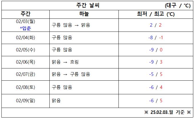 2월 1주 차 아침 기온 -9도에서 2도, 낮 기온 -1도에서 5도 예상됩니다.