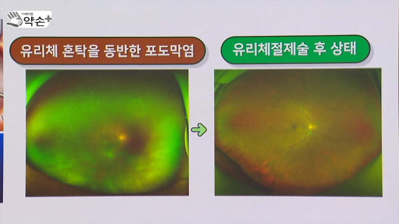 하지만 심한 염증으로 인해서 이미 혼탁이 심하게 남거나 이차적인 망막 점막이 동반된 경우에는 결국 염증 조절 후에 수술적 치료를 통해서 이를 해결해야 합니다.