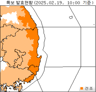 ▶ 건조주의보 : 대구, 경상북도(구미, 영천, 경산, 청도, 고령, 성주, 칠곡, 김천, 상주, 문경, 예천, 안동, 영주, 의성, 청송, 영양평지, 봉화평지)