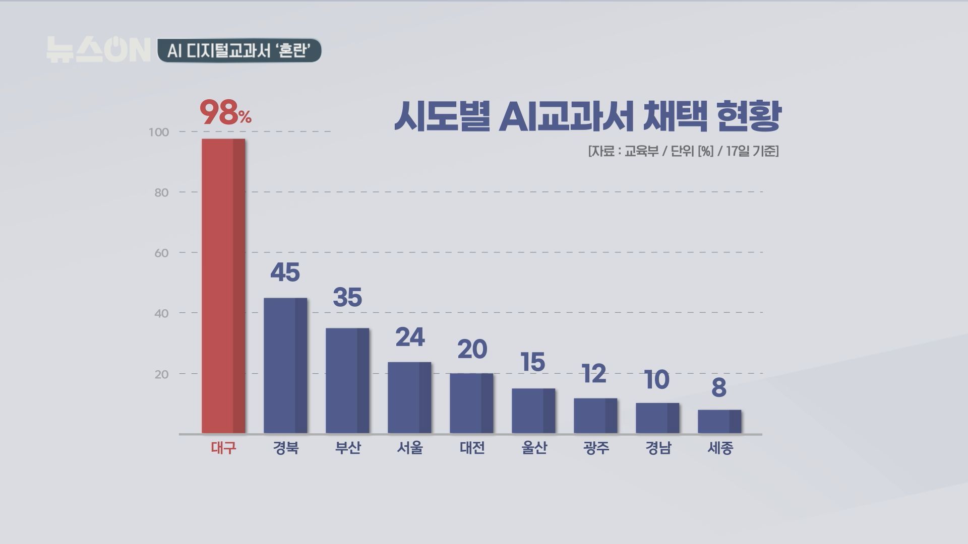 교육부는 지난 17일을 기준으로 AI 교과서 채택률을 32%로 발표했습니다. 학교 열 곳 중 3곳이 채택했다고 밝혔습니다. 그런데, 지역별로는 차이가 있습니다. 대구가 98%도 가장 높고, 강원 49%, 충북과 경북 45%, 경기·제주 44% 순으로 높았습니다. 교육부가 있는 세종은 8%, 전남 9%, 서울도 24%에 그쳤습니다. 교육감은 공천받지 않습니다만, 성향으로 분류되곤 하는데 보수 교육감이 있는 곳은 높고, 진보 성향 교육감이 있는 곳은 낮은 경향을 보였습니다. 보수 성향 교육감들이 있는 지역은 적극적으로 독려한 것으로 전해졌고요. 진보 성향 교육감들은 '신중해야 한다'는 의견이 많았던 것으로 알려졌습니다.