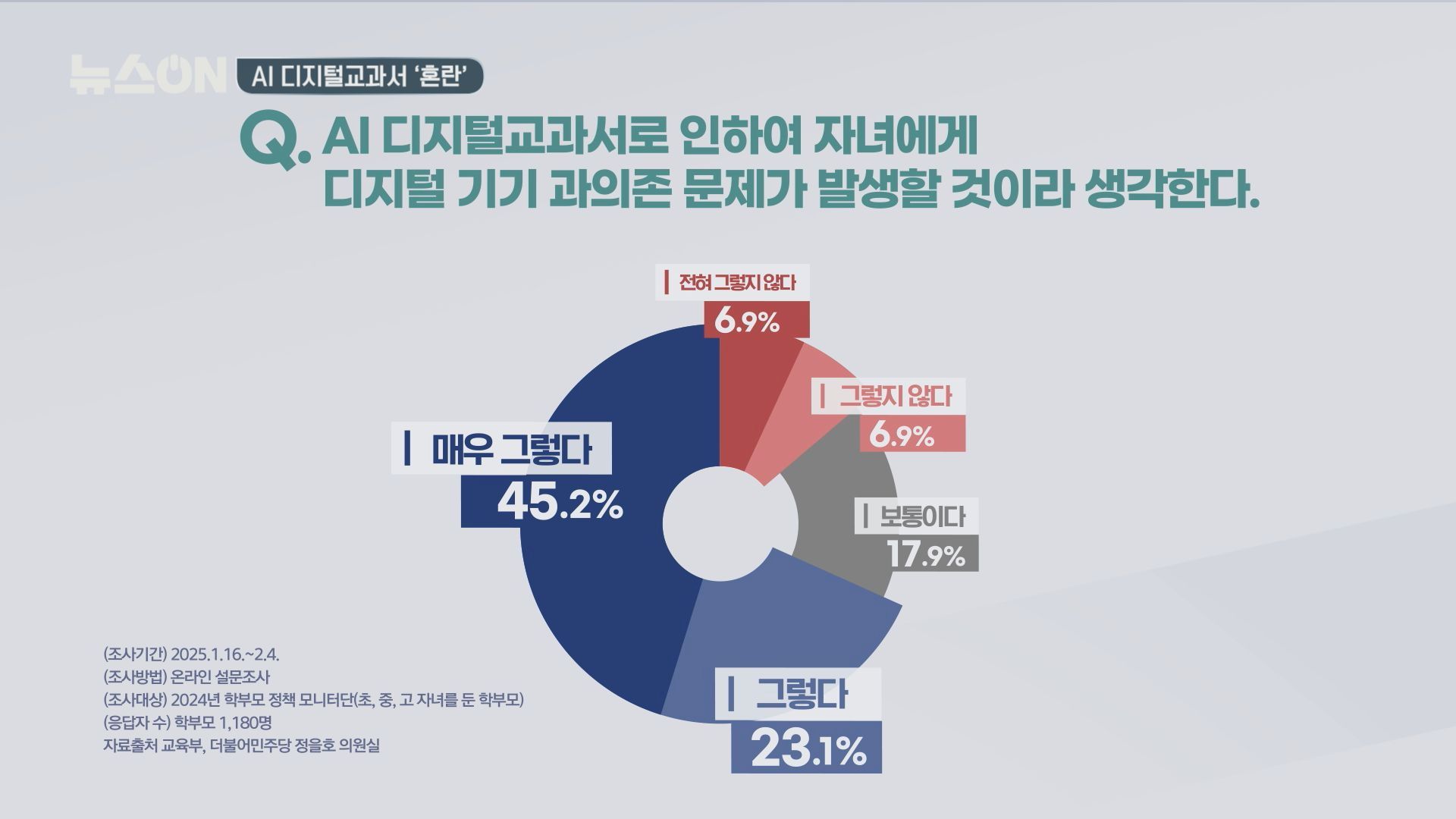 교육부는 지난 2023년 AI 디지털 교과서 추진 방안을 수립한 이후 최초로 2025년 1월 16일에서 2월 4일까지 20일간 초·중·고 자녀를 둔 학부모 정책 모니터단 1,180명을 대상으로 AI교과서에 대한 인식이 어떤지 설문조사했습니다. 조사 결과를 봤더니 AI 디지털교과서 효과와 관련한 9개 항목 중 8개 항목에서 부정적인 응답이 높았는데요. 특히, “디지털 기기 과의존 문제가 발생할 것인가?”라는 질문에 68.3%의 학부모가‘그렇다’또는‘매우 그렇다’로 답변했고요.“교사와 학생 간 소통에 도움 될 것인가”라는 질문에는 56%가 부정적으로 응답한 것으로 나타났습니다. “교사들이 학생 개별 지도에 도움이 될 것인가?”에 대한 질문에도 53.3%가 ‘그렇지 않다’ 또는 ‘전혀 그렇지 않다’로 답변한 것으로 나타났습니다.
