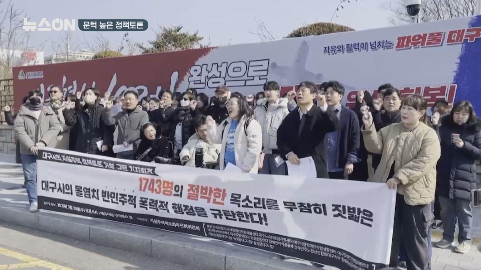 대구시에는 주요 정책에 대해 의견을 제시하고 논의하기 위한 정책 토론을 청구 조례가 있는데요. 하지만 청구할 문턱이 높아지더니 이제는 철벽이 쳐졌다는 반발이 나옵니다. 2023년에 대구시는 정책 토론 청구 기준을 300명에서 1,200명으로 4배 늘렸습니다. 그리고, 무더기로 허위 서명이 있다면서 고발하기도 했습니다. 이 부분은 무혐의로 결론 났습니다. 청구 기준 변경 전 접수된 정책 토론 중 '위기가구 종합지원 정책 토론 하나만, 대구시가 유일하게 개최했는데요.