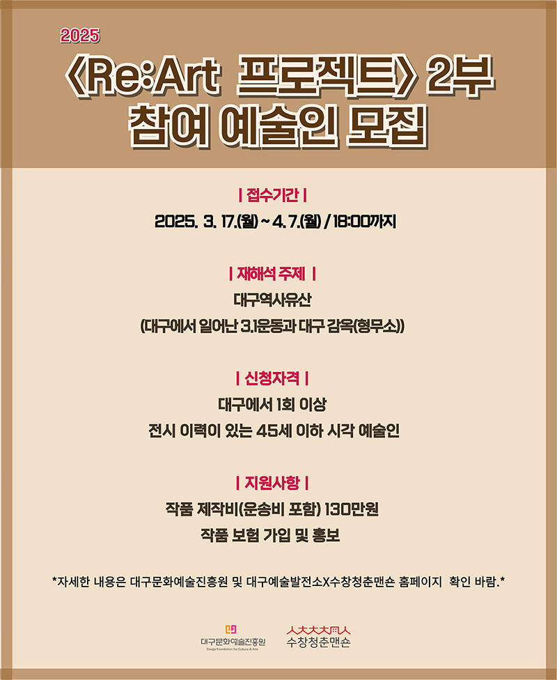 대구 수창청춘맨숀이 리아트(Re:Art) 프로젝트 2부에 참여할 청년 예술인을 찾고 있습니다.