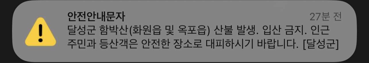 달성군은 화재 발생 1시간 20분 만인 저녁 8시 50분쯤 화원읍, 옥포읍 인근 주민과 등산객은 안전한 장소로 대피해달라는 재난 문자를 보냈습니다.