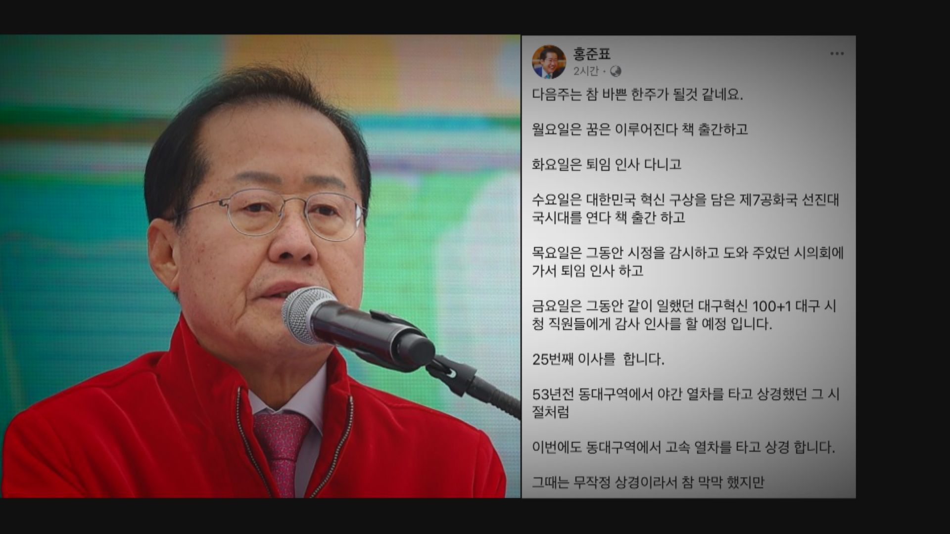 홍준표 대구시장이 다음 주 일정을 예고하며 조기 대선 행보에 나설 것임을 알렸습니다.