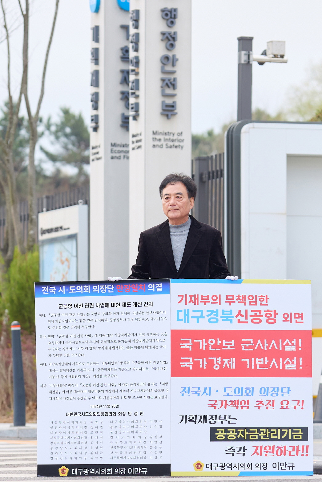대구시의회 이만규 의장이 대구경북신공항 건설 사업을 책임 있게 추진해달라며 기획재정부 앞에서 캠페인을 벌이고 있습니다.