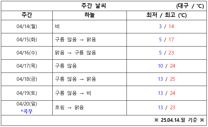 4월 3주 차 아침 기온 3도에서 13도, 낮 기온 14도에서 25도 예상됩니다.