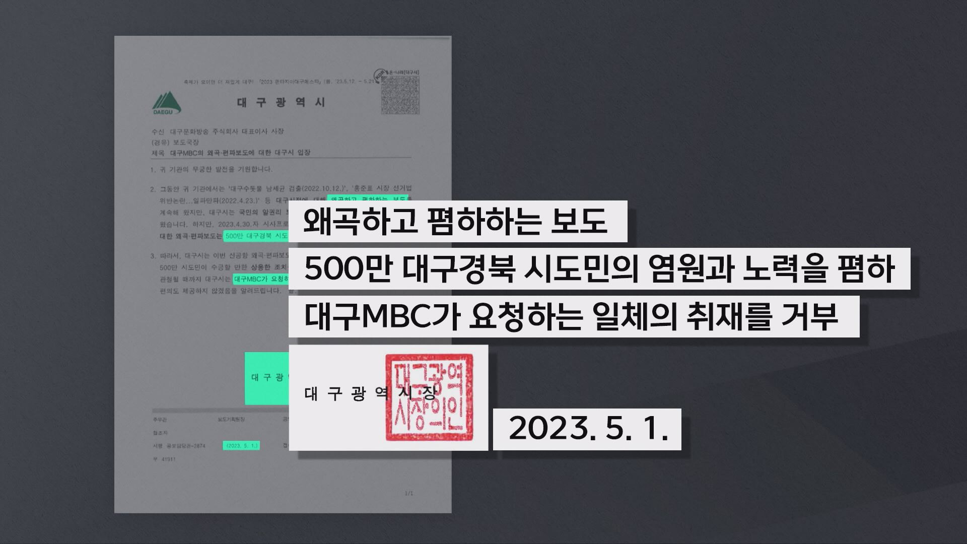2023년 5월 초 시작된 당시 홍 시장과 대구시의 대구MBC 취재 거부에 대해 법원에서 취재 방해를 하지 말라는 가처분 인용까지 있었지만 바뀌지 않았다는 지적이었습니다.