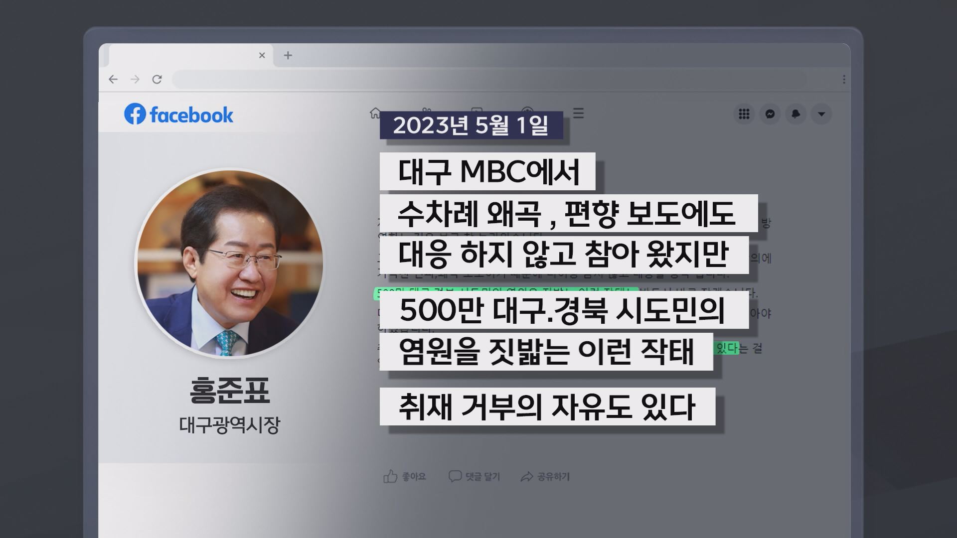 자신의 SNS에 "대구MBC가 수차례 왜곡, 편향 보도에도 참아왔지만 500만 대구·경북 시도민의 염원을 짓밟는 작태를 바로 잡겠다"고 했습니다.