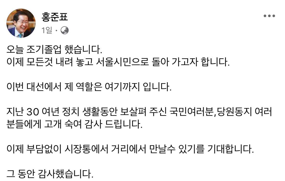 대구시장을 중도 사퇴하고 대권에 도전했던 홍준표 전 대구시장이 국민의힘 대선 2차 경선에서 탈락하자 정계 은퇴를 선언했는데요. 정치권은 여러 이슈로 요동치고 있지만, 대구 시민 입장에서는 이 뉴스도 여러 각도로 와닿을 것 같습니다.