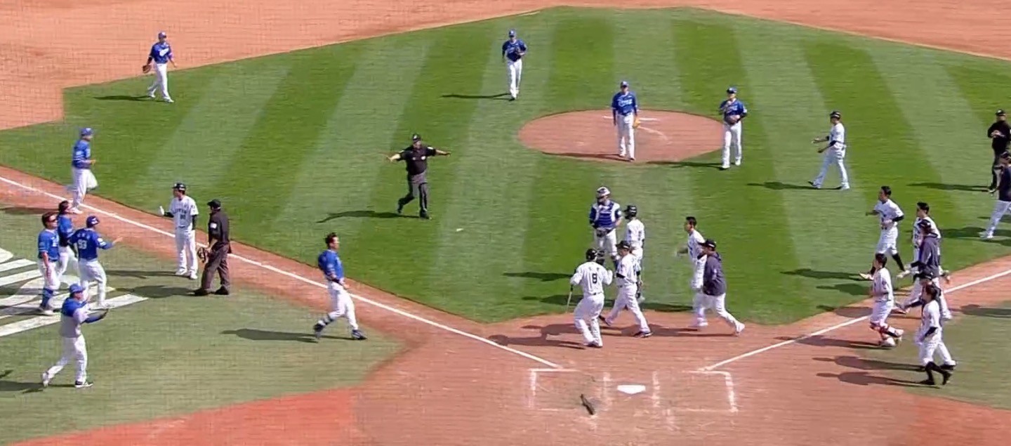 설상가상으로 다음 타자 윤동희에게 던진 초구가 다시 머리 쪽으로 향하며 롯데 벤치는 김태형 감독부터 격한 항의와 함께 그라운드로 향했고, 결국 벤치클리어링으로 이어졌습니다.