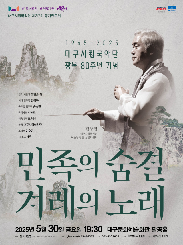 대구시립국악단 제217회 정기연주회이자 광복 80주년 기념 공연 '민족의 숨결 겨레의 노래'가 5월 30일 저녁 7시 30분 대구문화예술회관 팔공 홀에서 열립니다.