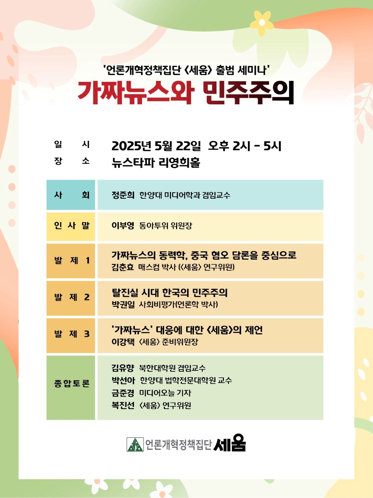 '언론개혁정책집단 세움'은 출범과 함께 첫 공식 행사로 5월 22일 '가짜 뉴스와 민주주의'라는 주제의 세미나를 개최합니다.