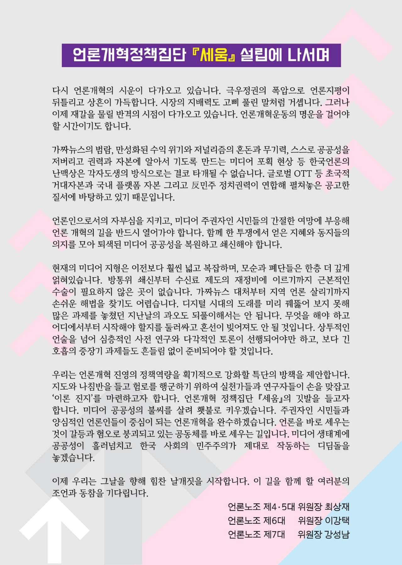 언론개혁정책집단 '세움'은 "언론의 공공성을 복원하고, 시민과 언론인의 권리를 지키기 위해 근본적인 개혁이 필요하며, 이를 위해 시민과 양심적인 언론인이 주체가 되어 언론 개혁을 추진해야 한다"고 천명했습니다.