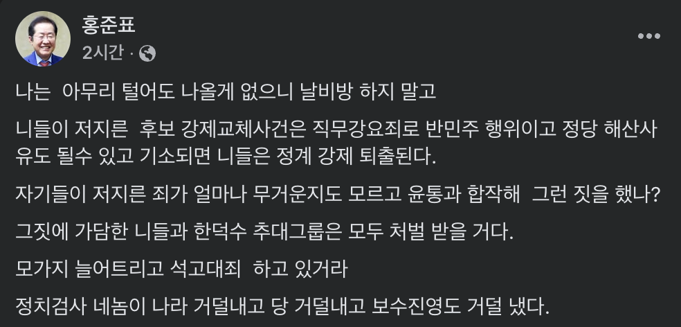 홍 전 시장은 6월 7일 자신의 SNS에 "너희가 저지른 후보 강제 교체 사건은 반민주 행위로 정당 해산 사유가 될 수 있고, 직무강요죄로 기소되면 너희는 정계에서 강제 퇴출된다"며, "그 짓에 가담한 너희와 한덕수 추대그룹은 모두 처벌받을 것이고, 석고대죄하고 있으라"고 말했습니다.