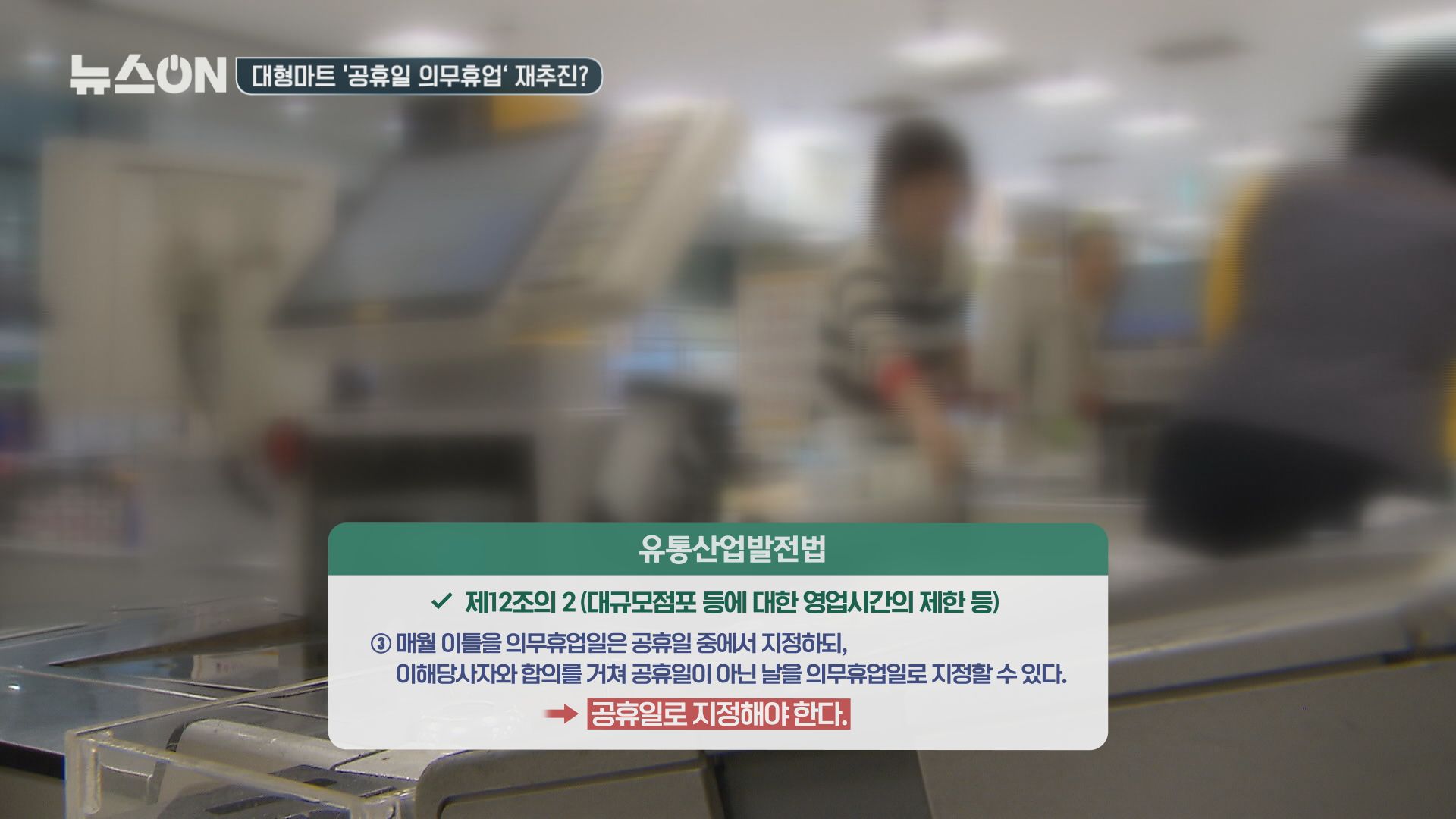 현행 유통산업발전법은 자치단체장은 대형마트가 매월 공휴일 이틀을 쉬도록 해야 하지만 “이해당사자와 합의를 거쳐 공휴일이 아닌 날을 의무휴업일로 지정할 수 있다”라고 돼 있는데요. 지난해 9월 발의된 개정안은 대형마트 의무휴업일은 월 2회 공휴일에만 하도록 하는 내용을 담고 있습니다.