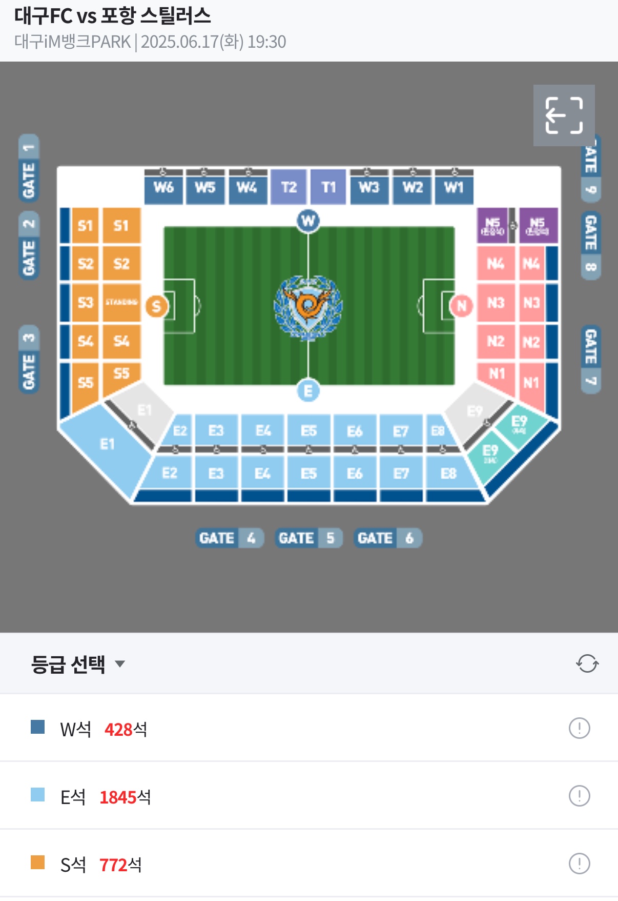 6월 17일 저녁 7시 반 대구iM뱅크파크에서 펼쳐지는 하나은행 K리그1 2025 19라운드 포항스틸러스와의 홈 경기를 앞둔 가운데 경기를 9시간 정도 남긴 오전 10시 반 기준, 관중석은 3천석 이상 팔리지 않은 상태입니다.