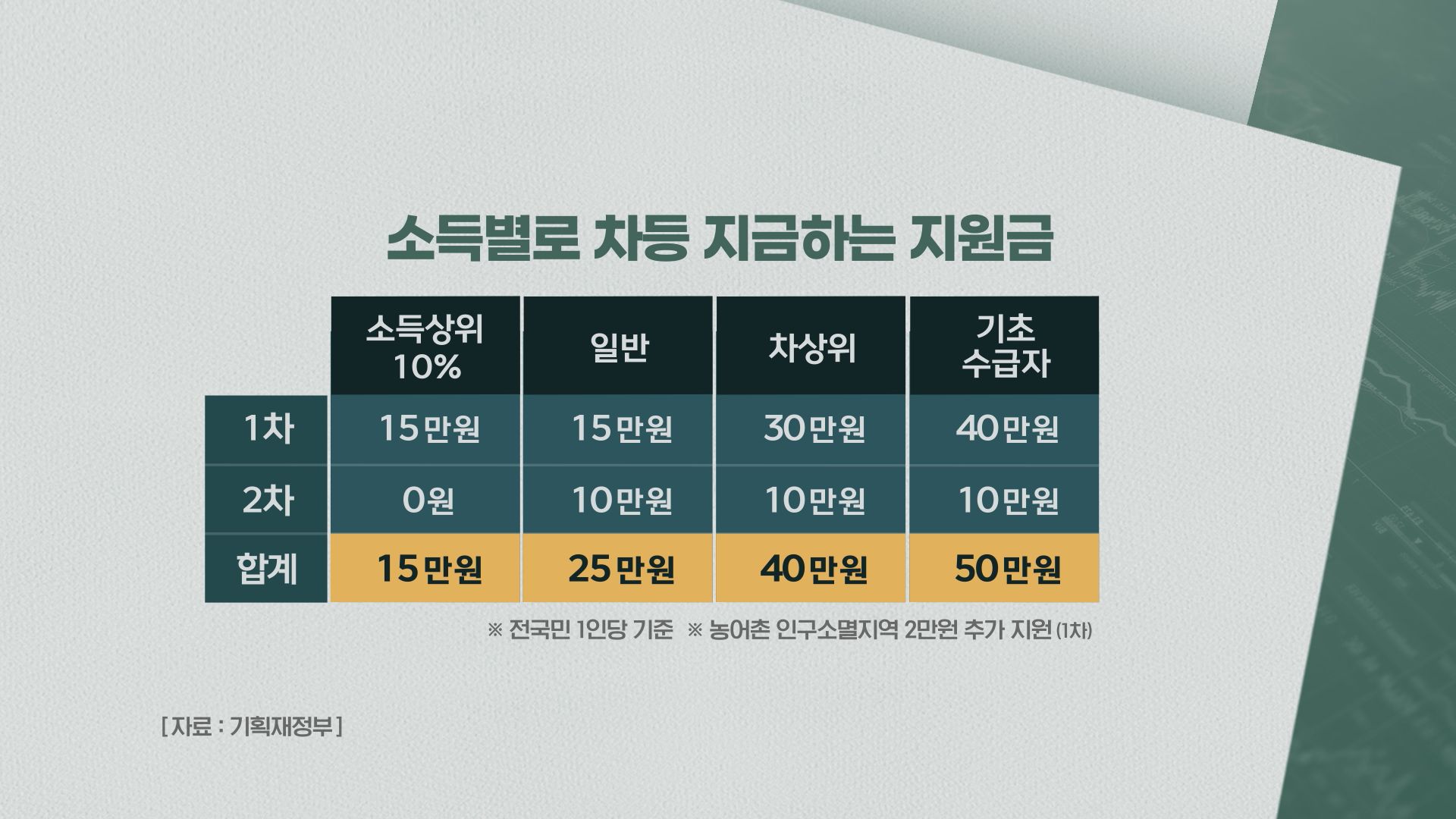 민생회복 소비쿠폰에 쓰이는 예산은 13조2000억 원으로 추경안의 절반을 차지하는데요. 정부는 보편 지급이 아닌 '소득별'로 나눠 차등 지급하기로 했습니다. 512만 명인 상위 10%에는 15만원, 4천 200여 만 명의 일반 국민에 25만 원, 차상위 38만 명 40만 원, 기초수급자 271만 명은 50만 원을 지급합니다. 농어촌 인구소멸지역은 2만 원이 추가됩니다.