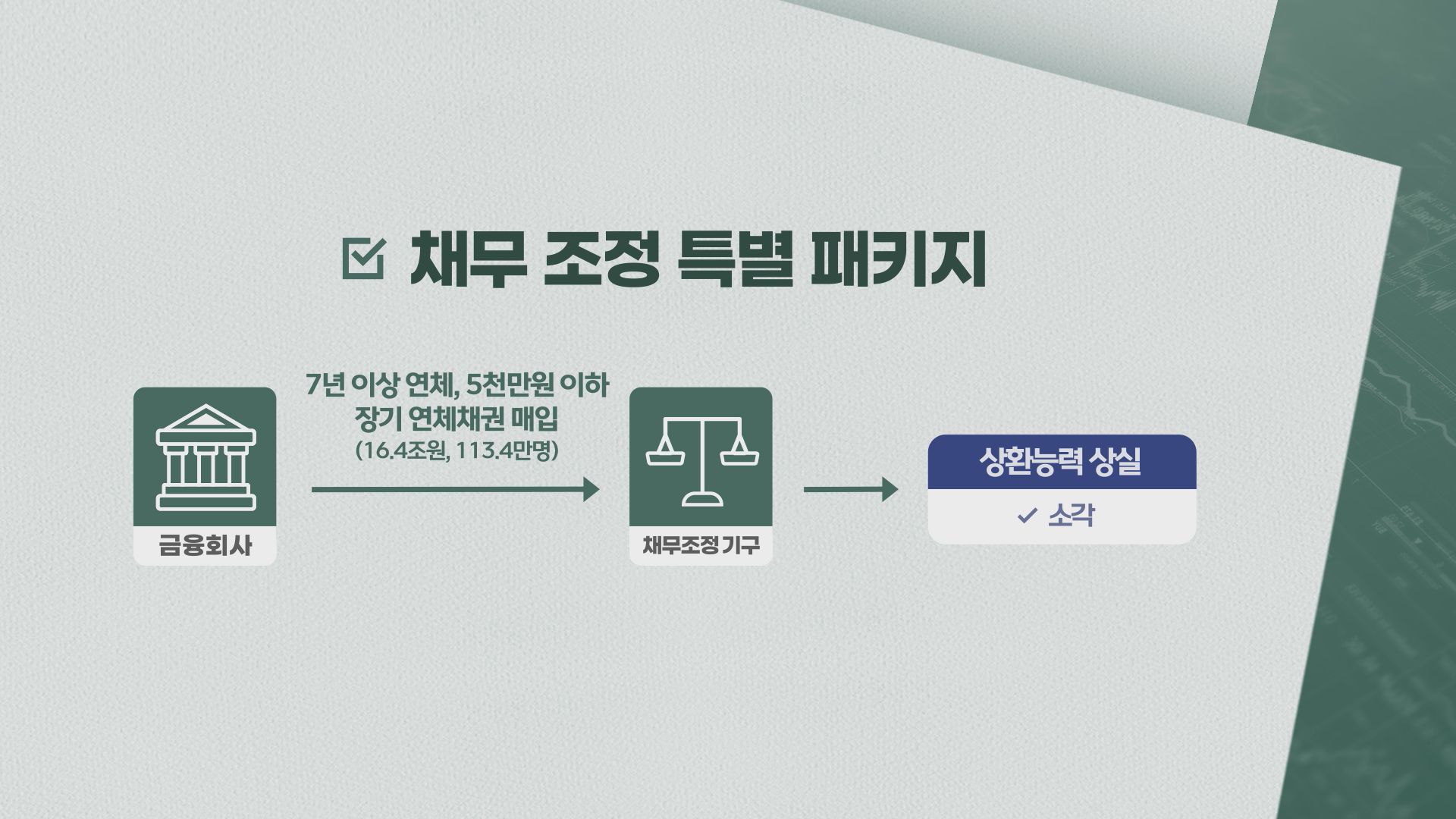 2차 추경에 따라 금융위원회는 7년 이상 연체된 5천만 원 이하 개인 무담보 채권을 일괄 매입해 채무조정 합니다. 매입 채권 규모는 16조 4천억 원으로 113만 4천 명이 혜택을 받을 것으로 추정되는데요. 심사를 거쳐 개인 파산에 준하는 수준의 상환능력을 상실한 경우로 인정되면 해당 채권은 소각됩니다.