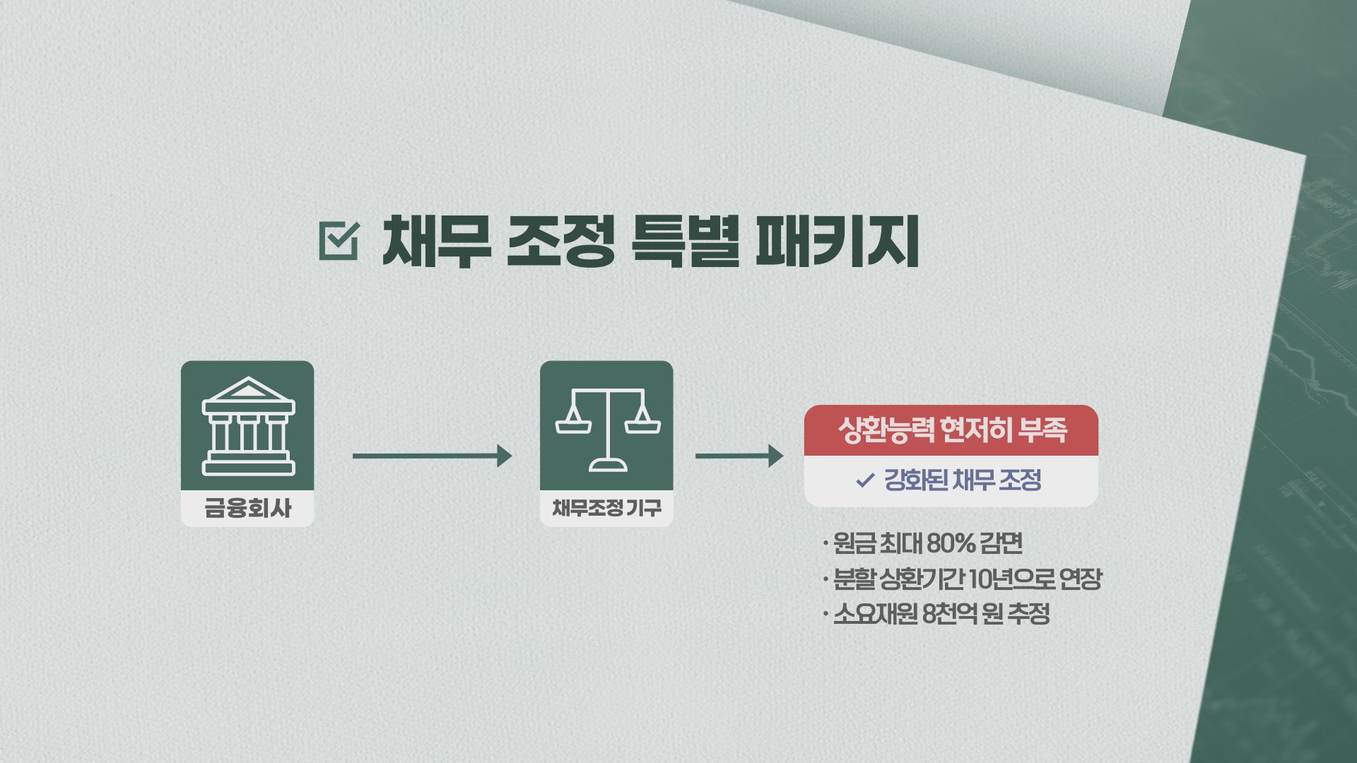 또, 채무에 비해 상환능력이 현저히 부족한 경우에는 원금을 최대 80% 감면해 주고 분할 상환 기간을 10년으로 늘리는 채무조정이 이뤄지는데요. 소요 재원은 8천억 원으로 추정하고 있습니다. 이밖에 지방의 준공 후 미분양 매입 등 건설경기 활성화를 위해 2조 7천억 원, 고용 안전망 강화에 1조 6천억 원을 편성했습니다.
