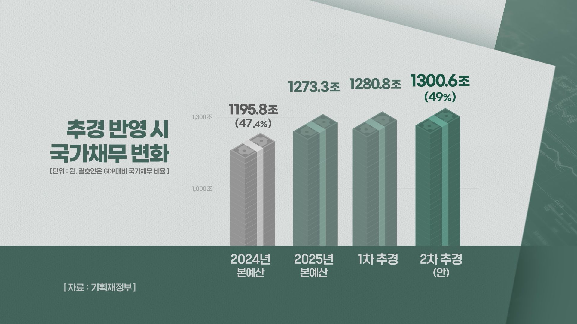 이번 추경으로 2025년 총지출은 702조 원으로 지난해보다 6.9% 늘어나게 됩니다. 총지출이 700조 원을 넘는 건 처음입니다. 또, 지출이 늘면서 관리재정수지 적자 규모는 GDP 대비 2024년 3.3%에서 2025년 4.2%로 높아지고, 국채 발행 증가로 2025년 말 국가채무는 1,300조 원을 넘겨 GDP의 49%에 달할 전망인데요. 나랏빚 비율이 나쁜 건 아니지만, 빚이 늘어나는 속도가 빠른 점은 주의해야 한다는 지적도 있는데요. 재정 건전성 악화를 감수하더라도 소비와 투자 활성화가 성장 회복으로 이어지는 선순환 구조로 만들겠다는 게 정부 입장입니다.