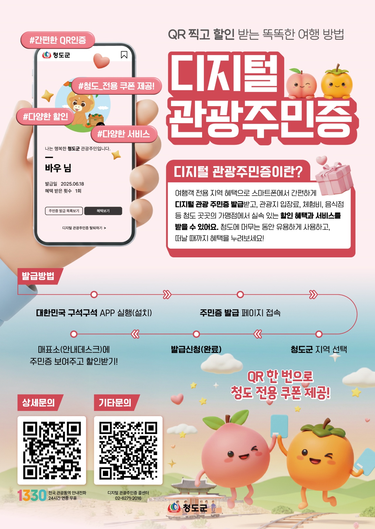 디지털 관광 주민증은 관광객에게만 발급하는 명예 주민증으로, 대한민국 구석구석 앱에서 QR코드를 내려받아 청도군과 협의가 이뤄진 제휴 업체에 보여주면 할인 혜택을 받을 수 있습니다.