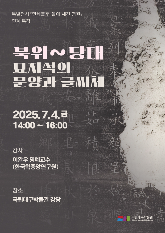 국립대구박물관은 특별전 '만세불후-돌에 새긴 영원'과 연계한 특별 강연 '북위~당대 묘지석의 문양과 글씨체'를 7월 4일 오후 2시에 엽니다.
