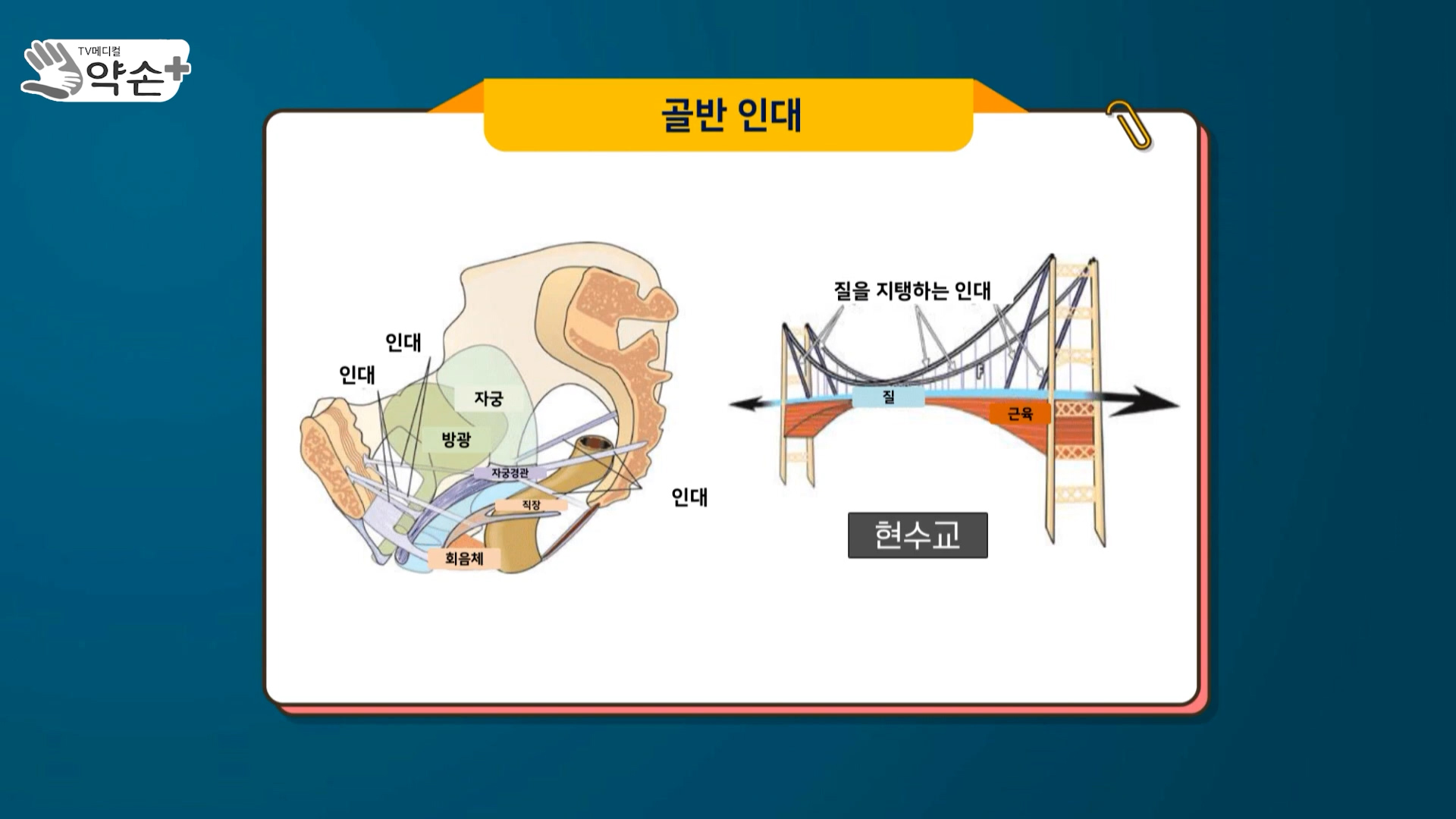 골반 인대도 중요하지만, 장기들이 밑으로 빠져나오지 못하도록 받쳐주는 근육들이 있습니다. 그게 골반저근인데요. 골반저근 중에서도 항문을 들어 올리는 항문거근이 있습니다. 이 근육들은 골반 장기가 못 내려오도록 막고 있는 역할을 하게 되고, 또 소변이나 대변을 볼 수 있도록 힘을 조절하는 역할을 하게 됩니다.