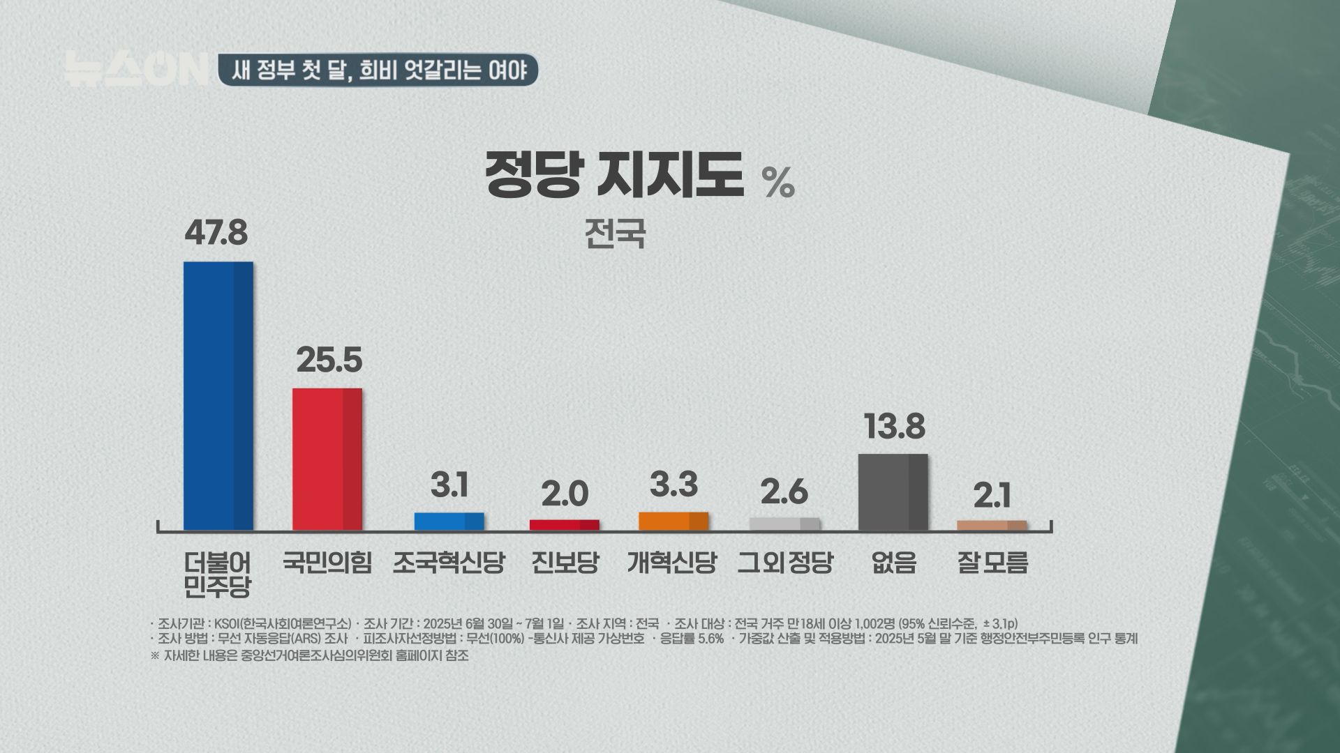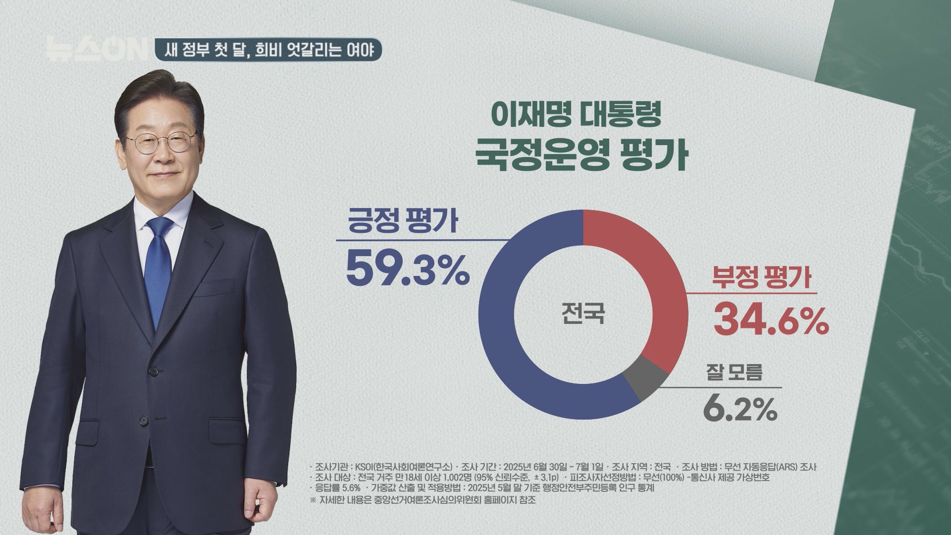 일단 취임 초, 대통령과 정부를 향한 민심은 긍정적으로 보입니다. 최근 발표된 한국사회여론연구소 조사 결과에 따르면 이재명 대통령 국정운영 긍정 평가가 59.3% 60%에 육박했습니다. 보수지지세가 강한 대구·경북에서도 긍정 평가가 48.8%로 부정 평가 45.2%와 오차 범위 안으로 나타났습니다.