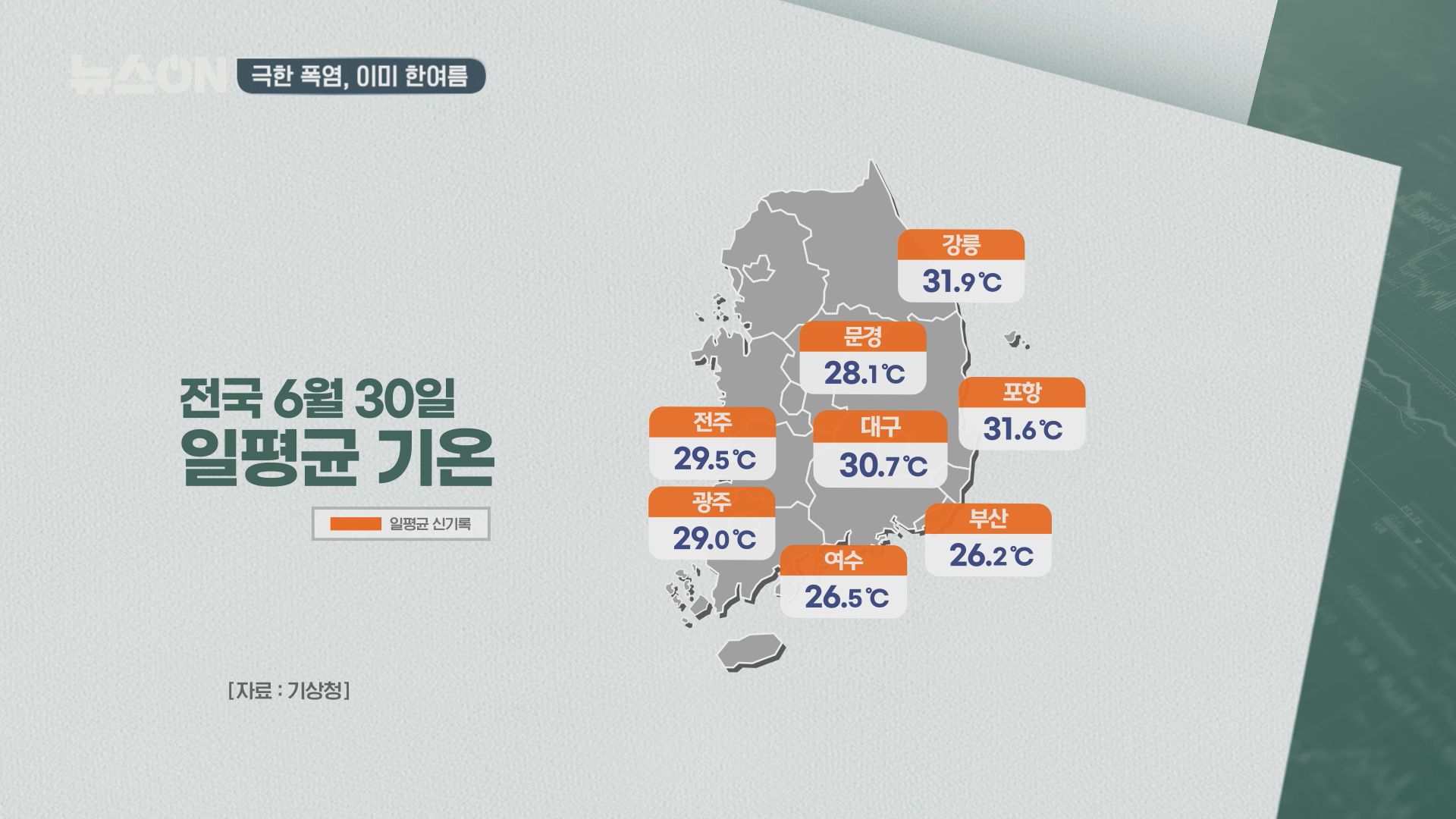6월 30일 대구의 일평균 기온은 30.7도로 1907년 대구에서 기상 관측을 시작한 이후 가장 높은 6월 일평균 기온 중 가장 높았습니다. 이전에 가장 높았던 건 2005년 6월 25일 30.1도였습니다. 대구뿐 아니라 포항 31.6도, 광주 29도, 부산 26.2도 등을 보였습니다.