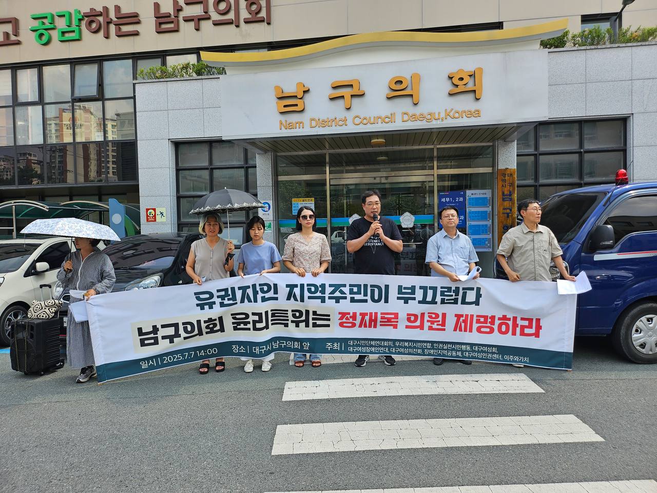 대구시민단체연대회의 등 대구 시민단체 9곳은 7일 오후 2시 대구 남구의회 앞에서 기자회견을 열고 정 의원이 주민 대표인 선출직 공직자로서 자격이 있는지 의구심이 든다며 정 의원의 제명을 촉구했습니다.