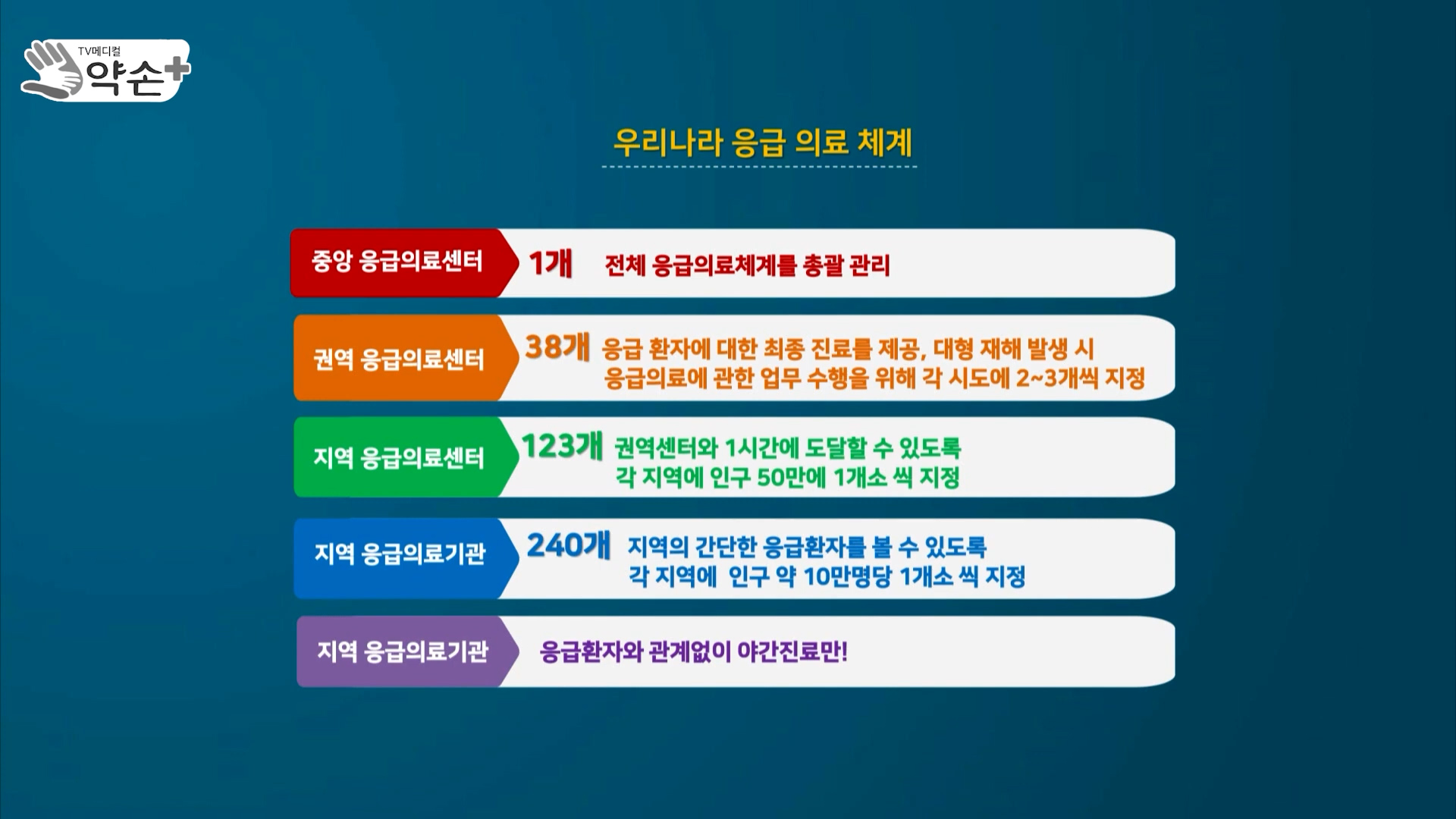 그리고 '지역응급의료센터'는 인구 50만에 1개씩 지정해 놓고 있고, 전국에 123개가 있습니다. 그 밑으로는 '지역응급의료기관'이 인구 10만 명당 1개씩, 240개 구성되어 있어서, 전체 우리나라 응급실은 한 400여 개 있다고 보시면 되겠습니다.