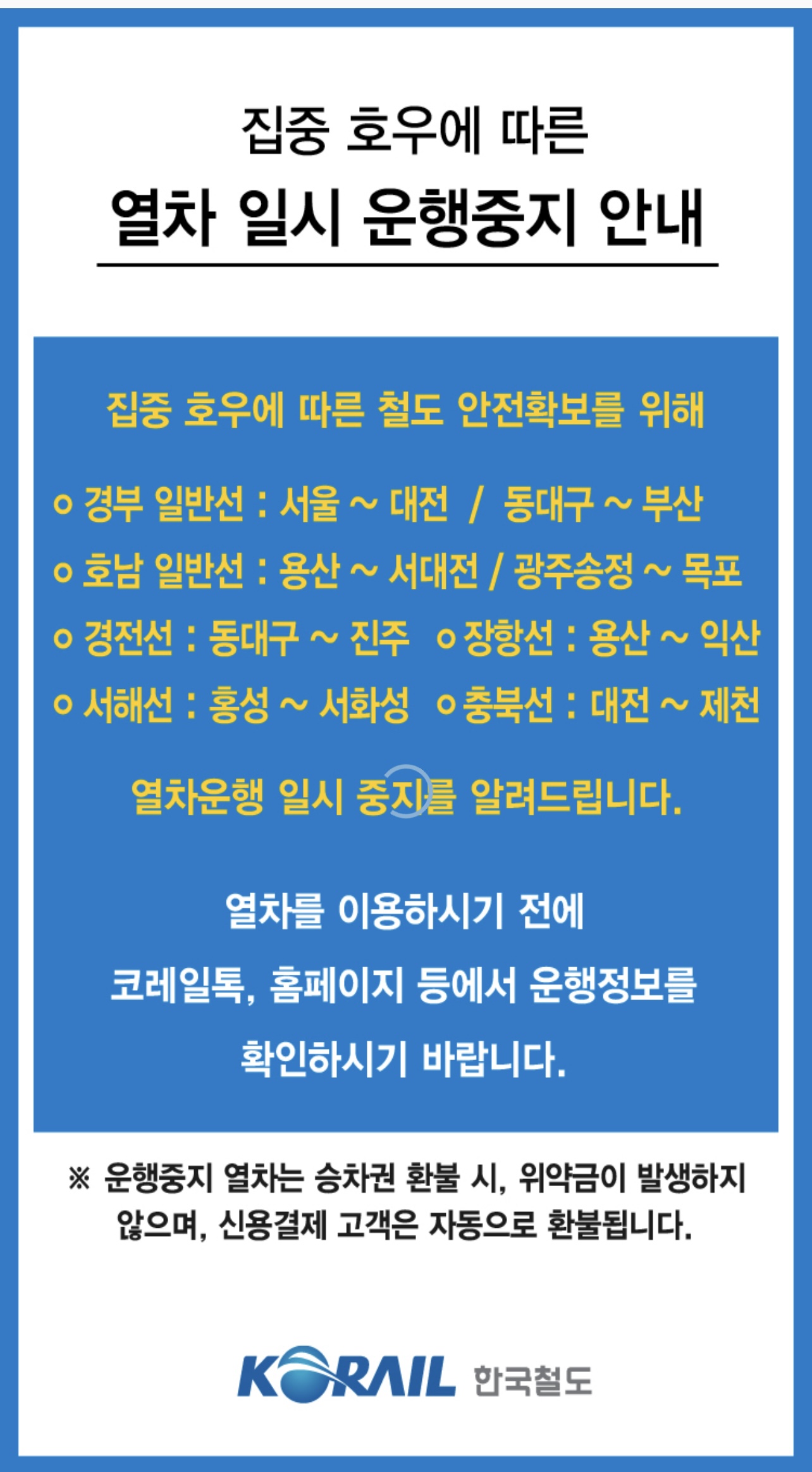 코레일 관계자는 내일 아침 시설을 점검한 뒤 열차 운행 여부를 결정할 계획이라며 자세한 사항은 앱 '코레일톡'과 레츠코레일 홈페이지, 철도고객센터(☎1544-7788)를 통해 확인해달라고 부탁했습니다.