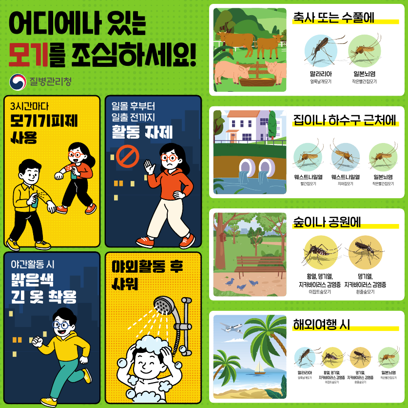질병청은 음식 조리 전후, 식사 전에는 비누로 30초 이상 손을 씻고 야외 활동 시 모기 기피제를 사용하라고 강조했습니다.