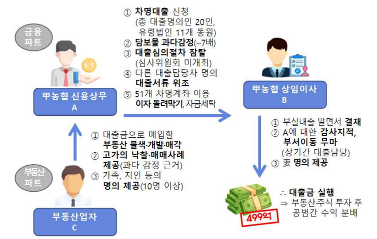 이 과정에 상임이사는 범행을 알고도 감사를 무마하고 가족 명의를 제공하는 식으로 범행을 도왔고 대출금 499억 원으로 부동산과 주식에 투자해 수익금을 나눠 가진 혐의를 받고 있습니다.