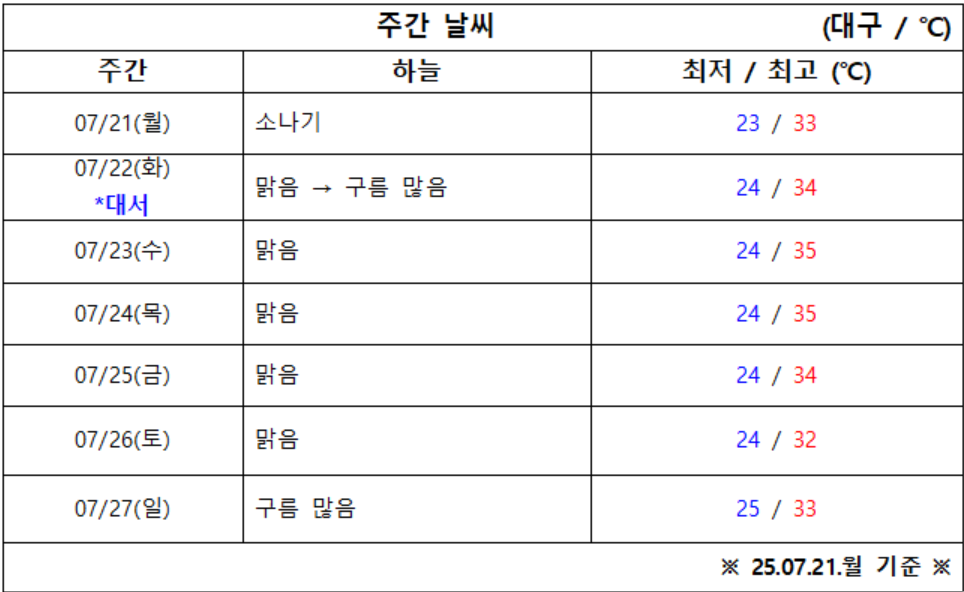 7월 4주 차 아침 기온 23도에서 25도, 낮 기온 32도에서 35도 예상됩니다.