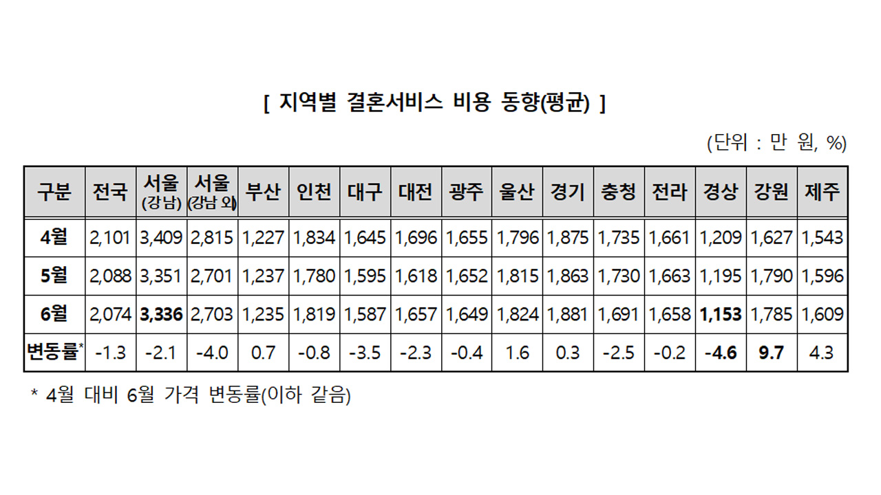 결혼 서비스 전체 비용이 지역 간 최대 3배가량 차이가 나는 것으로 나타났습니다.