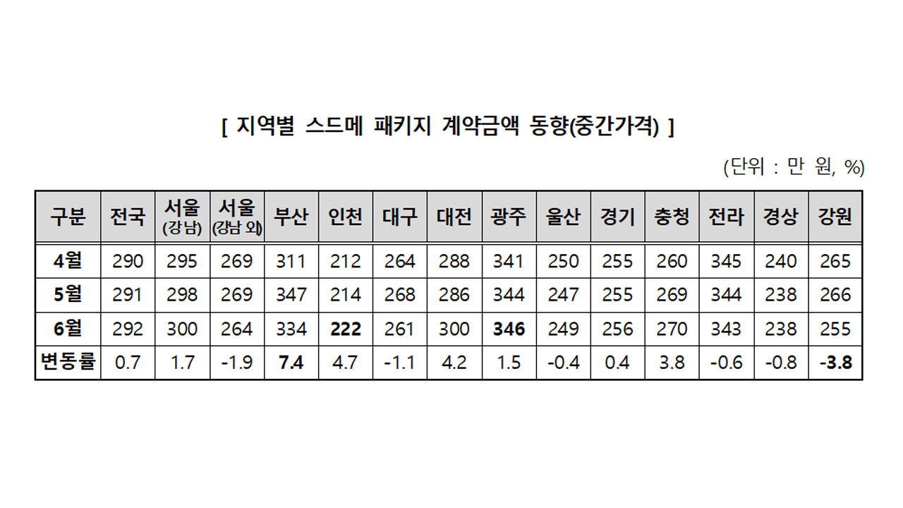 스튜디오, 드레스, 메이크업 상품을 하나로 묶은 스드메 패키지 중간 가격은 292만 원이었고 지역별로는 광주가 346만 원으로 가장 높았습니다.