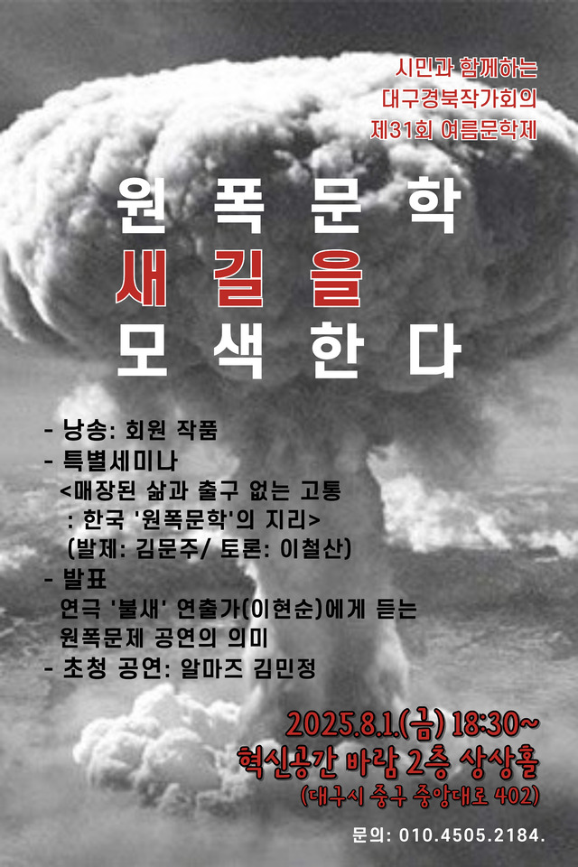 대구경북작가회의가 주최하는 ‘제31회 여름 문학제'가 ‘원폭 문학, 새 길을 모색한다’라는 주제로 열립니다.