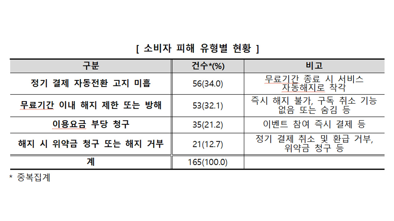 피해 유형은 '정기 결제 자동 전환 고지 미흡'이 34.0%(56건)로 가장 많았고, '무료 기간 이내 해지 제한 또는 방해' 32.1% (53건), '이용 요금 부당 청구' 21.2%(35건), '해지 시 위약금 청구 또는 해지 거부' 12.7%(21건)로 뒤를 이었습니다.
