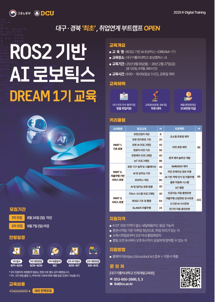 이에 따라 대구 경북 지역에서는 유일하게 ROS2 기반 인공지능 융합 로보틱스 부트캠프를 개설하고, 2025년 하반기부터 교육생 모집에 들어갔습니다.
