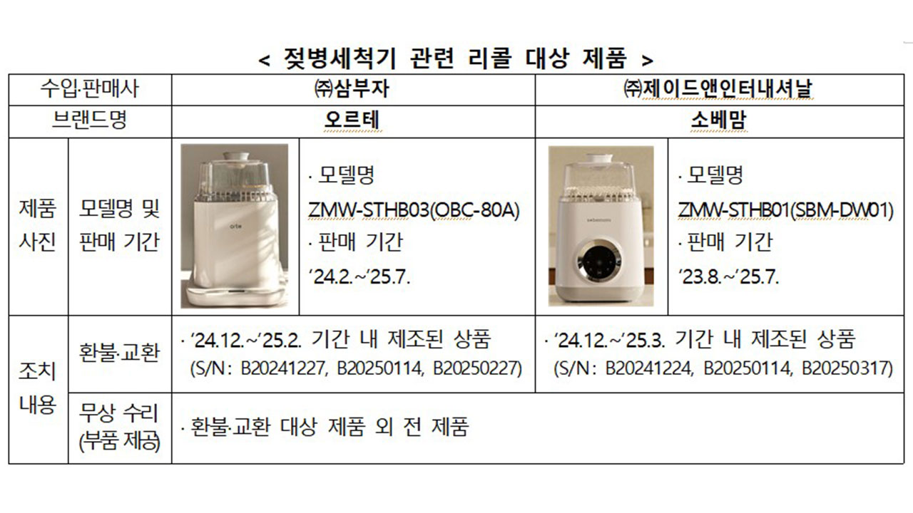 리콜 대상 제품은 2023년 8월부터 올해 7월까지 판매된 '소베맘'과 지난해 2월부터 2025년 7월까지 판매된 '오르테' 제품 3만 403개입니다.