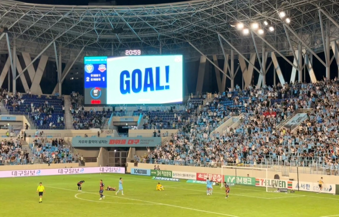 후반 48분, 세징야가 보낸 공을 헤더로 방향을 바꾼 카이오의 역전 골이 터지며 대팍은 열광이 빠져듭니다.