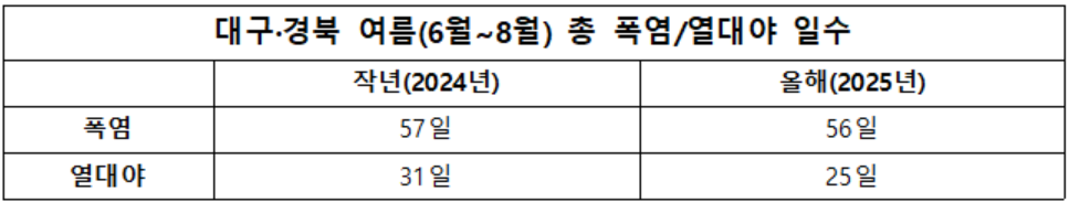 2024년 같은 기간 우리 지역의 열대야 총일수는 31일로 2024년과 비교하면 조금 줄었지만, 2025년에도 여전히 잠 못 이루는 밤이 많았습니다.