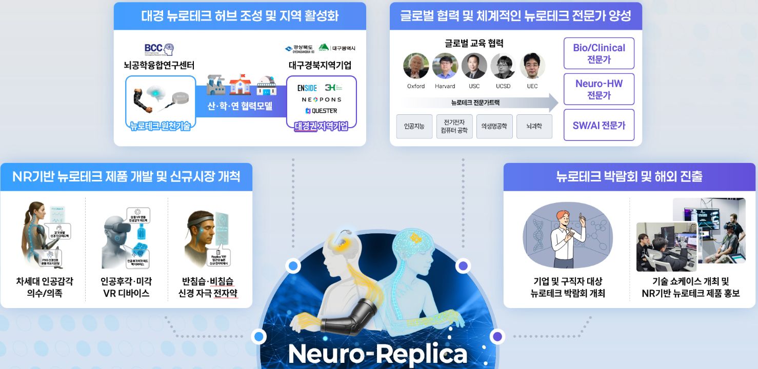 뇌공학융합연구센터의 핵심 목표는 '뉴로-레플리카'로 신경회로 디지털 트윈 기술을 개발하는 것으로, 뉴로-레플리카는 실제 뇌 신경세포의 전기 생물학적 신호를 정밀한 AI 기반 컴퓨터 전기회로 모델로 가상 환경에 복제하는 기술입니다.