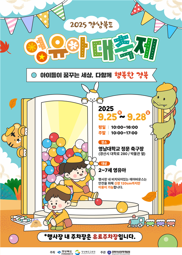 경상북도와 경상북도 교육청은 저출생 극복과 아이 우선 문화 정착을 위한 '2025 경상북도 영유아 대축제'를 2025년 9월 25일부터 28일까지 영남대학교 경산캠퍼스에서 개최합니다.