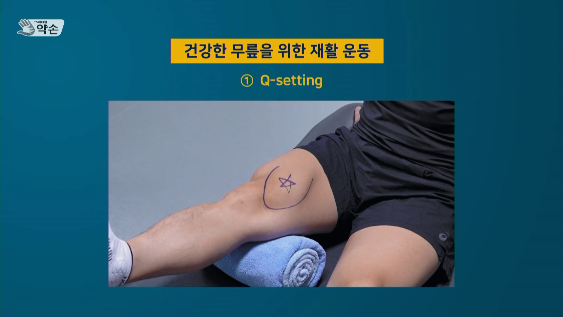 Q-Setting이 있습니다. 대퇴사두근을 만드는 가장 편하고 안전하게 할 수 있는 운동이 되겠습니다. 무릎 밑에 베개나 수건을 깔고 무릎을 펴주는 운동인데요. 발이 땅에 닿지 않으면 운동 효과가 더 크고, 발목을 젖히면 좀 더 안전한 운동이 되겠습니다. 내쪽 대퇴사두근에 어느 정도 신경을 쓰면서 운동을 해 주면 좋겠습니다.