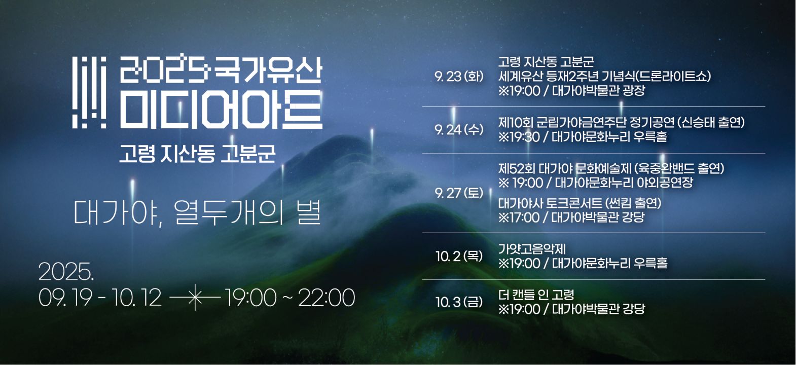 국가유산청과 경상북도, 고령군이 주최하는 이번 미디어아트의 주제는 '대가야, 열두 개의 별'로 대가야 악성 우륵 선생이 작곡한 가야금 12곡과 고령 지산동 고분군에 담긴 대가야의 영광이 미디어아트를 통해 재해석됩니다.